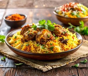 Fragrant basmati rice cooked with tender chicken, aromatic spices, and a touch of saffron.