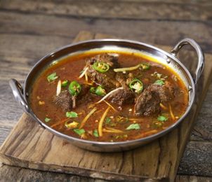 Slow-cooked beef stew rich in flavor, served with fresh naan and traditional garnish.