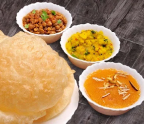 A morning delight — 2 puris, halwa, chana & aloo bhujia served hot every day.